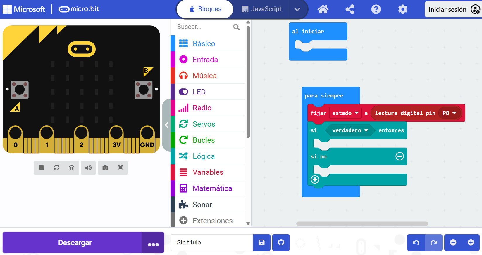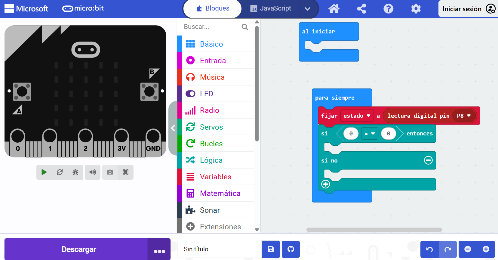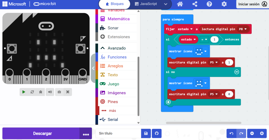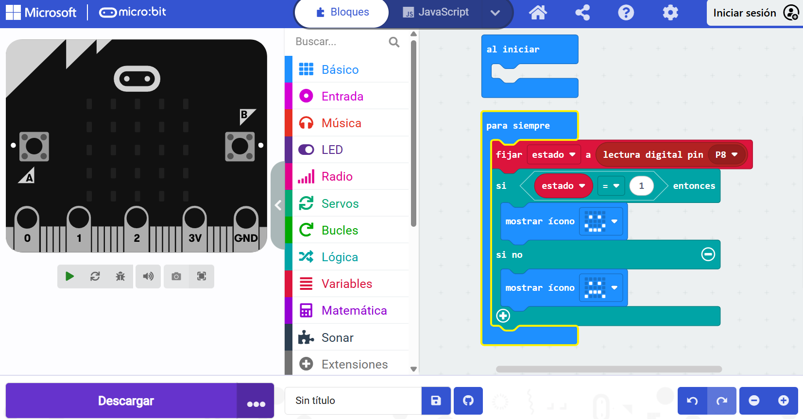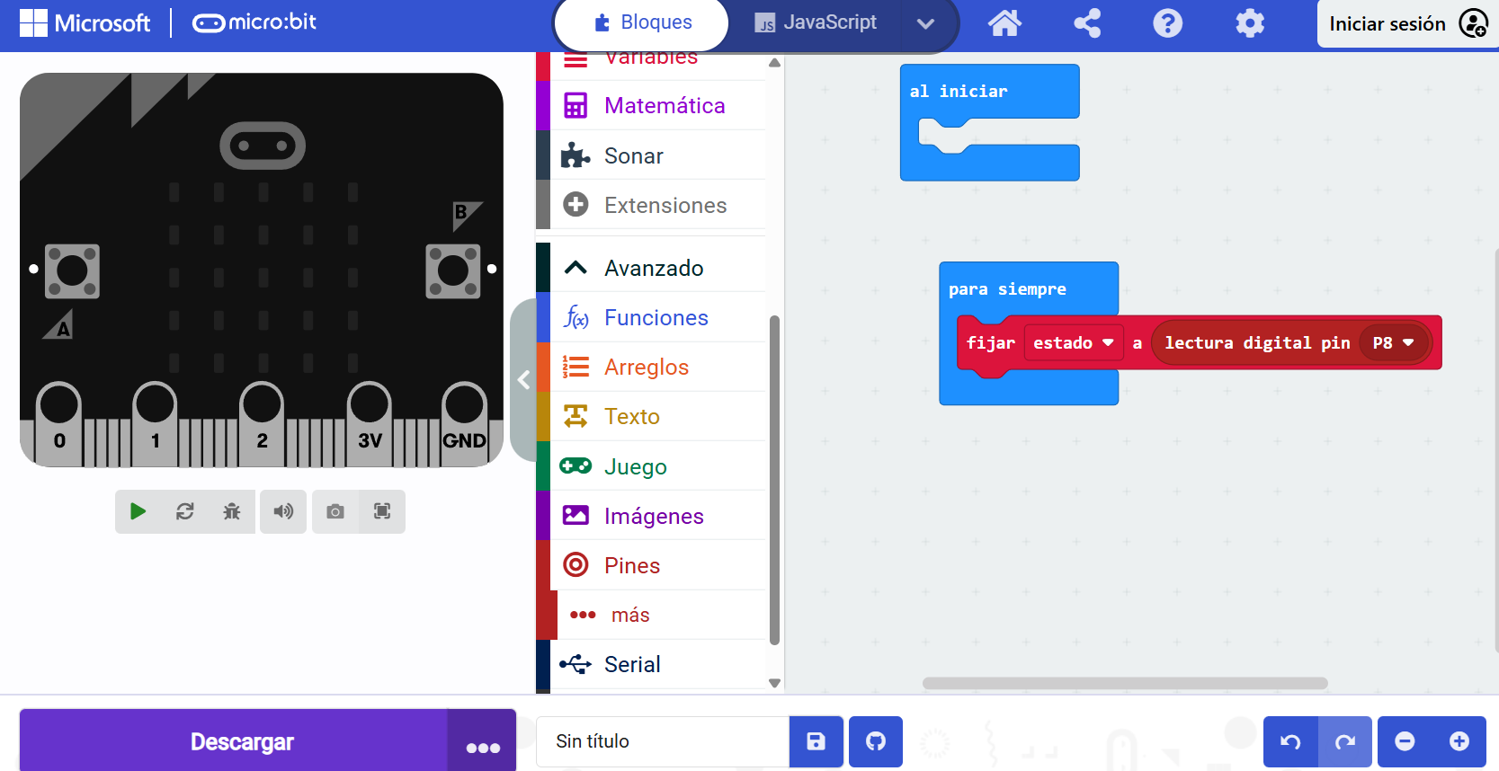 El valor que guardaremos en la variable estado es la lectura del pin digital P8 (que nos dará 0 si el pulsador no se presionó y 1 si el pulsador se presionó). Encontrarás el bloque «lectura digital» en la sección pines.