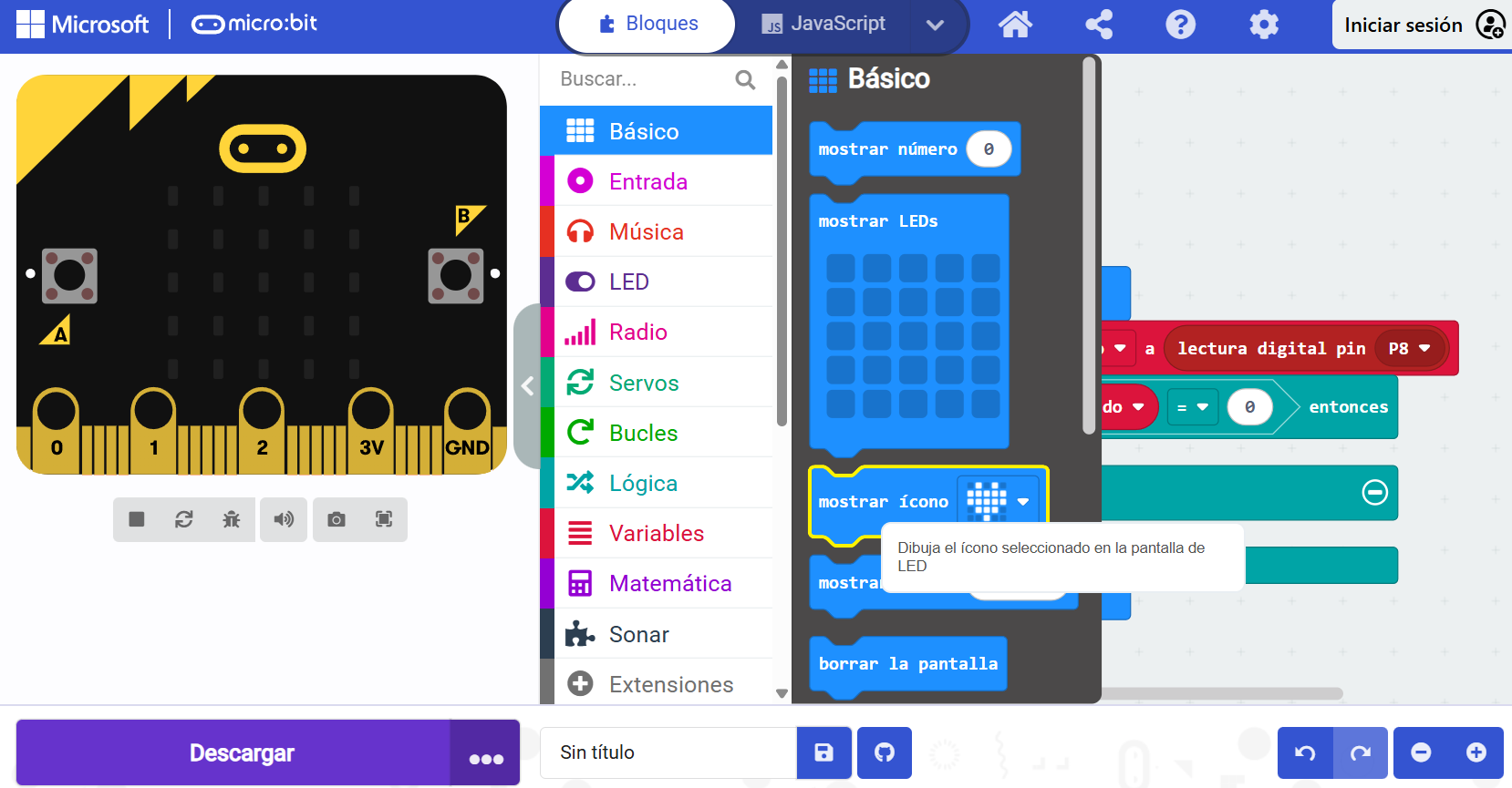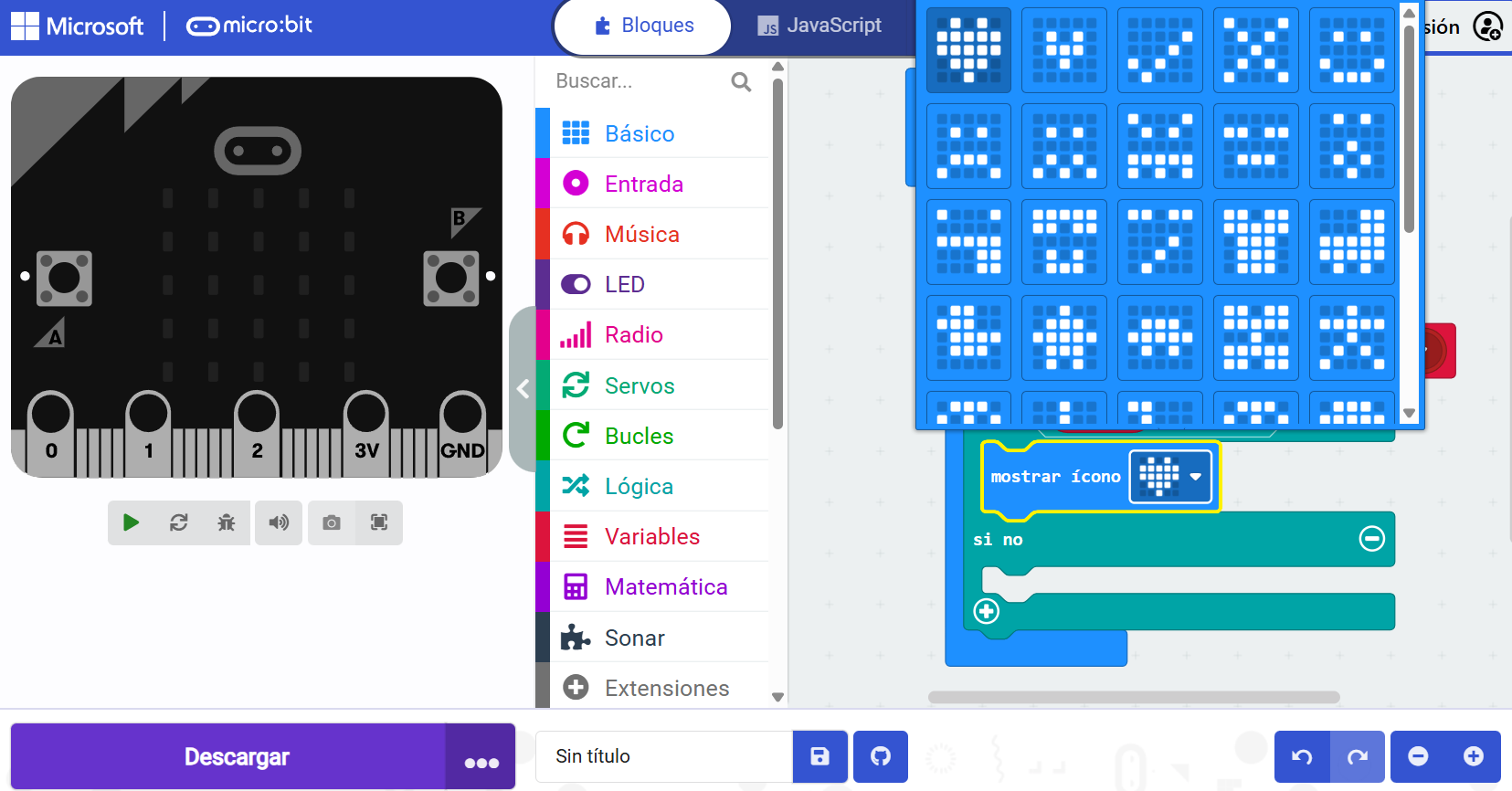 Si la variable estado vale 1, dibujamos una cara sonriente en la matriz de leds utilizando el bloque «mostrar icono» que encontrarás en la sección básico. Si pulsas sobre el icono podrás verás todos los iconos disponibles. Si estado no vale 1, mostramos una carita triste.