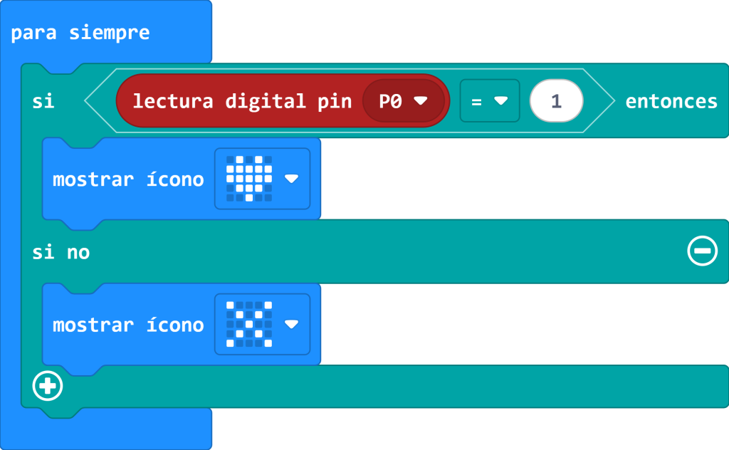 Para determinar el el sensor está inclinado o no, utilizamos un condicional «si…entonces…si no…». El sensor estará inclinado cuando la lectura del pin digital 0 (donde habíamos conectado el sensor) es igual a 1.
